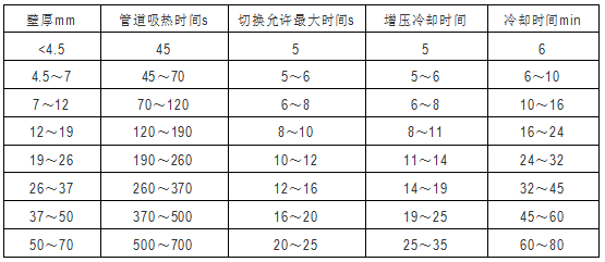 根据PE管道材质在每个时间范围内取个值中加在一起就是每个口需要的焊接时间.焊接好的管口冷却时间一般为10-12倍管壁厚。